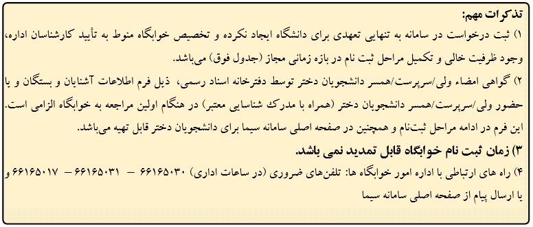 3- طبق قوانین اسکان (مندرج در دفترچه انتخاب رشته)، با توجه به محدودیت ظرفیت، به دانشجویان ساکن در استان تهران و توابع آن، استان البرز و همچنین دانشجویان بورسیه، خوابگاه تعلق نمیگیرد.