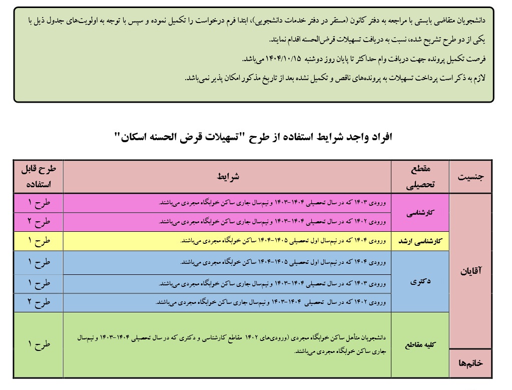 شروع نام نویسی مرحله بیستم اعطای تسهیلات قرض الحسنهی اسکان (جایگزین خوابگاه) از تاریخ 1 الی 15 دی ماه 1404 به دانشجویان ساکن خوابگاههای دانشجویی