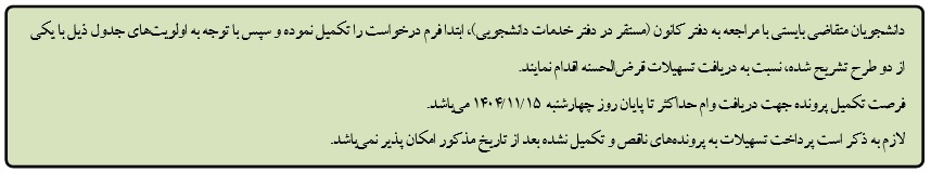 تمدید نام نویسی مرحله بیستم اعطای تسهیلات قرض الحسنهی اسکان (جایگزین خوابگاه) از تاریخ 24 دی ماه الی 15 بهمن ماه 1404 به دانشجویان ساکن خوابگاههای دانشجویی